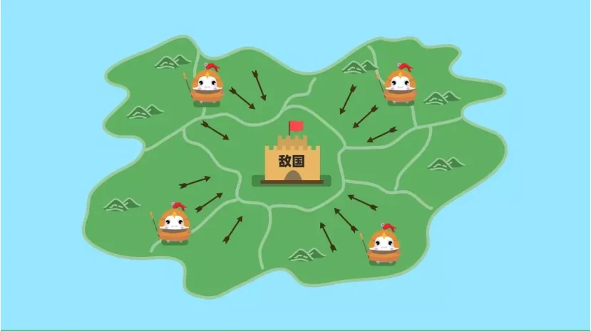 拜占庭将军问题通过一个经典军事场景,揭示了分布式网络的核心通信困境。故事中,拜占庭帝国派出多支军队围攻敌国,由于敌军实力,分散在四周的将军们必须在同一时间发动进攻才能取胜——这就如同分布式网络中,分散的节点需要通过信息交换达成共识才能统一行动。