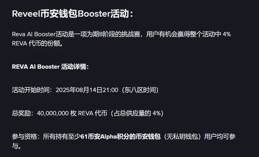当前位置:首页 > 实时快讯 > 正文 币安钱包上线Reveel(REVA)Pre-TGE及Booster活动,用户可参与认购与空投 实时快讯 作者:猎奇网 时间: 2025-08-13 18:16:13 浏览:31 币安钱包宣布,将于8月13日上线Reveel(REVA)代币的Pre-TGE及Booster活动。Pre-TGE活动允许符合条件的用户在REVA正式交易前优先认购;Booster活动则要求用户完成阶段性任务以支持项目早期发展,从而瓜分额外4千万枚REVA的空投奖励。 相关文章: 币安上线 CROSS 代币并启动空投活动2025-07-04 14:04:31 币安上线Yala代币并启动分阶段空投活动2025-07-22 17:51:22 币安上线Gaia代币并启动分阶段空投活动2025-07-30 14:45:20 币安钱包上线Bitlayer代币预售活动,8月13日开启认购2025-08-12 12:10:38 币安钱包上线Reveel(REVA)Pre-TGE及Booster活动,用户可参与认购与空投2025-08-13 18:16:13 币安部分用户被限制参与PLUME空投 上线时间将动态调整2025-08-18 20:53:11 币安钱包上线Hemi Pre-TGE活动,参与需Alpha积分达2402025-08-22 18:43:31 币安钱包第36期TGE上线Forest代币,认购时间及参与方式公布2025-08-30 19:32:38 币安钱包推出Quack AI代币空投活动2025-09-02 15:40:01 币安启动Alpha积分用户代币空投活动2025-09-20 17:29:27
