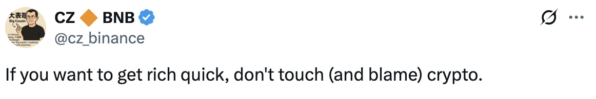 当前位置:首页 > 实时快讯 > 正文 币安前CEO呼吁投资者理性对待加密货币市场 实时快讯 作者:猎奇网 时间: 2025-07-07 22:36:41 浏览:40 7月7日,币安(Binance)前首席执行官赵长鹏(CZ)在社交媒体平台X发布声明称:”若寻求短期暴利,建议远离加密资产投资领域。”该言论配发的截图显示其社交账号当日发布的相关推文内容。 相关文章: 民调:73%加密货币投资者支持特朗普数字资产政策2025-07-04 09:02:41 币安前CEO呼吁投资者理性对待加密货币市场2025-07-07 22:36:41 分析师:市场对关税反应温和,投资者或已提前调整投资组合2025-08-01 08:53:16 OKX CEO强调X Layer长期生态价值 呼吁投资者理性规避短期炒作风险2025-08-21 22:23:50 柯俊堂:稳定币普及或降低跨境支付成本 提醒投资者理性参与2025-08-31 10:06:12 韩国散户投资者2023年对美股加密货币关联企业投资超120亿美元2025-08-31 18:49:52 机构投资者黄金与加密货币配置比例对比2025-09-01 11:33:34 韩国散户投资者减持特斯拉股票转向加密货币领域2025-09-01 14:07:39 加密市场分化走势与投资者资产调整2025-09-02 00:11:18 日本拟升级加密货币监管框架 投资者保护机制将全面强化2025-09-04 19:36:12