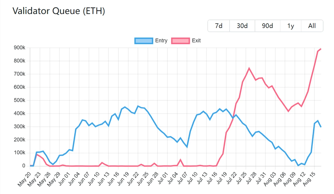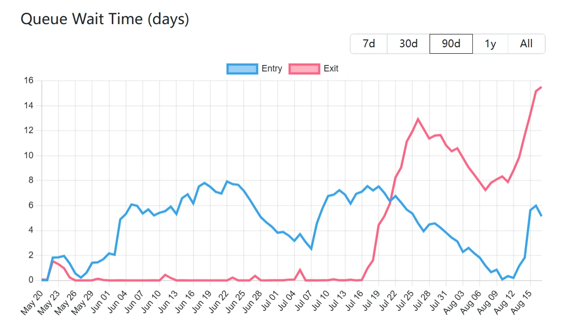 当前位置:首页 > 实时快讯 > 正文 以太坊PoS网络验证者退出与新增质押队伍列规模分析 实时快讯 作者:猎奇网 时间: 2025-08-18 08:53:27 浏览:33 以太坊PoS网络验证者退出队伍列规模于8月18日激增至872,893枚ETH(约39亿美元),连续6日增长态势使退出等待时间延长至15天4小时;同期新增质押ETH待激活队伍列规模达259,783枚(约1.6亿美元),激活延迟维持4天12小时水平。 相关文章: 以太验证者退出队伍创年内新高 质押供需双增态势延续2025-07-23 09:24:19 以太坊PoS网络退出队列激增,提款延迟超12天2025-07-27 15:03:08 以太坊验证者退出队列创历史新高,Aave流动性冲击引发连锁反应2025-07-29 23:11:42 以太坊PoS网络退出队伍激增,新验证者准入需求下降2025-08-17 14:37:02 以太坊PoS网络验证者退出与新增质押队伍列规模分析2025-08-18 08:53:27 以太坊PoS网络验证者退出与新增质押队列创新高2025-08-19 11:55:47 以太坊PoS网络验证者退出与准入队列数据更新2025-08-23 09:29:49 以太坊PoS网络验证者退出队伍规模激增,质押总量占比达29.45%2025-08-27 14:22:25 以太坊PoS网络待质押ETH创2023年9月来新高 待退出量连续下滑2025-09-03 13:15:38 以太坊PoS网络9月12日退出与准入队列数据公布2025-09-12 14:41:05