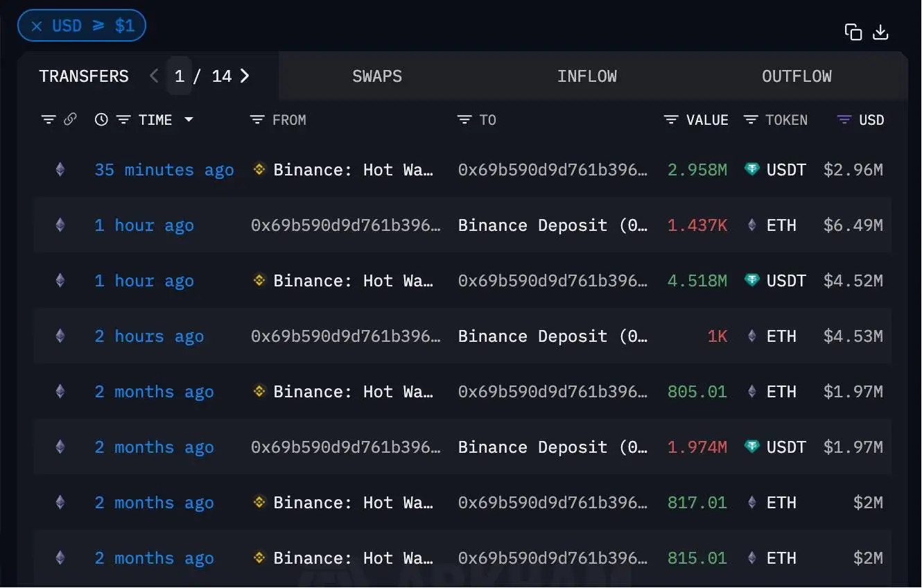 当前位置:首页 > 实时快讯 > 正文 链上分析师Ai姨监测:某地址完成2437枚ETH清仓操作并获利505.5万美元 实时快讯 作者:猎奇网 时间: 2025-08-18 09:26:44 浏览:35 链上分析师Ai姨监测显示,0x69b...0e378地址于8月18日完成2437枚ETH清仓操作。该地址两个月前以2448美元均价建立仓位,近两小时将全部ETH转入币安交易所并提取部分USDT,预计实现505.5万美元账面利润。 相关文章: 链上分析师监测:波段巨鲸ETH操作实现百万美元盈利2025-07-28 23:22:15 链上分析师Ai姨监测:两新地址6小时内从CEX提走7107万亿枚代币2025-08-14 11:09:07 链上分析师Ai姨:新地址二次补仓PEPE,累计浮亏14万美元2025-08-15 11:21:51 链上分析师监测:ETH聪明钱四次波段全胜后清仓获利10.8万美元2025-08-15 19:40:53 链上分析师Ai姨监测:两地址7小时将1791.5枚ETH换仓为35.18万枚LINK2025-08-17 09:48:13 链上分析师Ai姨监测:某地址完成2437枚ETH清仓操作并获利505.5万美元2025-08-18 09:26:44 链上分析师监测大额抄底操作:地址提走逾1700万美元加密货币2025-08-18 18:03:28 链上分析师监测:某地址单笔投入76.7万美元购入2770万枚YZY代币致K线插针2025-08-19 22:00:35 链上分析师监测:巨鲸地址清仓4720枚以太坊获利超950万美元2025-09-01 09:50:32 某地址ETH交易获利670万美元 区块链分析师余热监测曝光2025-09-03 16:25:31