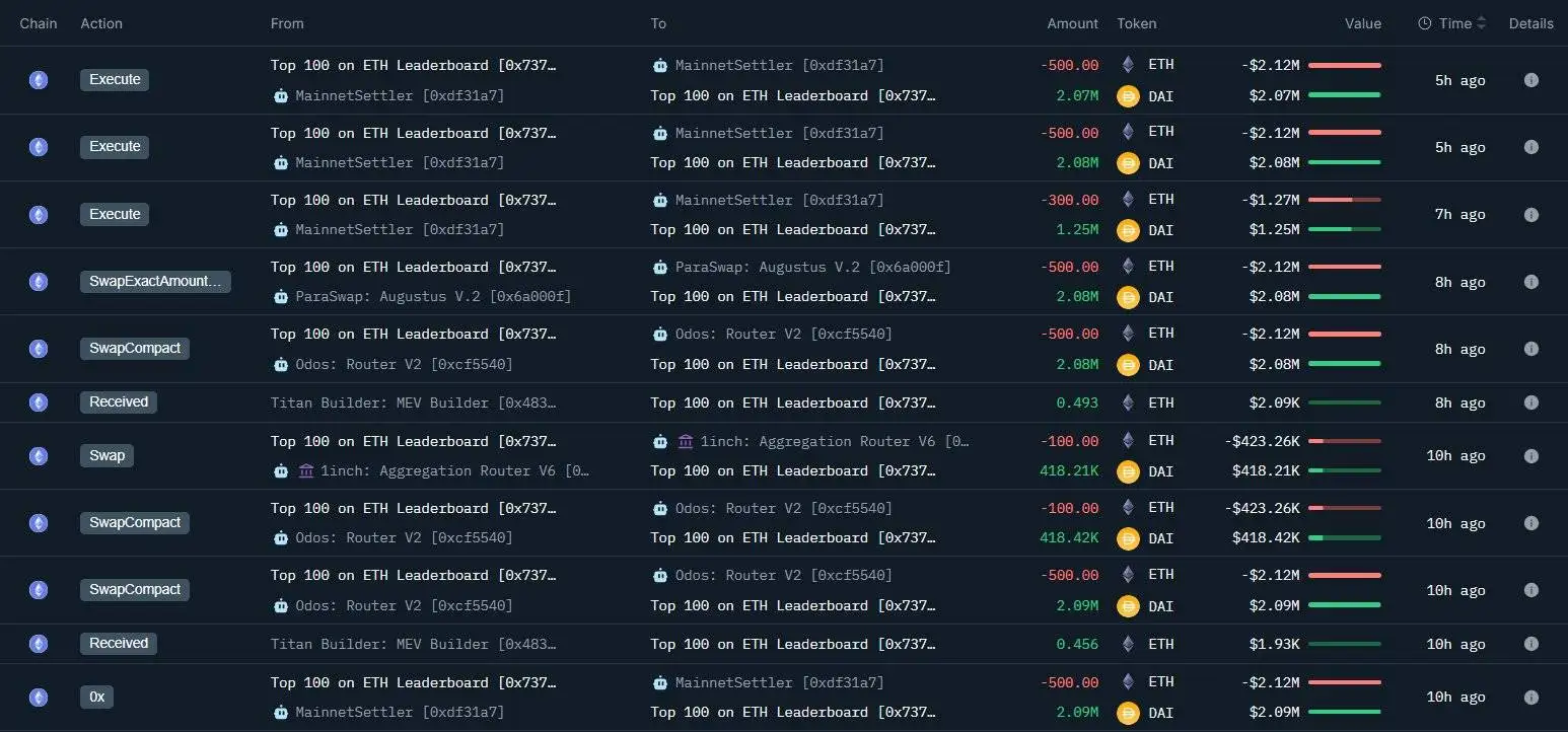 当前位置:首页 > 实时快讯 > 正文 以太坊鲸鱼地址单日抛售8,500枚ETH套现3,815万美元 实时快讯 作者:猎奇网 时间: 2025-08-20 09:10:22 浏览:33 链上分析师Onchain Lens监测显示,某以太坊鲸鱼地址于8月20日24小时内抛售8,500枚ETH,套现约3,815万美元DAI。该地址累计售出11,575枚以太坊,平均成交价4,440美元/ETH,总套现规模达5,140万美元。当前持仓数据显示其仍保留6,710枚ETH,按市价估算约合2,760万美元。 相关文章: 以太坊基金会关联钱包单日减持1,206.7枚ETH 套现361万美元2025-07-12 08:17:02 鲸鱼抛售1,700枚MKR套现347万美元,仍持有249.4万枚UNI2025-07-19 19:40:17 鲸鱼地址0xd8d0单日抛售逾8400万美元加密资产2025-08-07 21:31:53 鲸鱼地址抛售ETH套现2849万美元 过去五日累计出售9000枚2025-08-09 09:18:39 某地址20分钟抛售5299.5枚ETH套现2360万美元2025-08-16 17:55:28 鲸鱼地址抛售3,075枚ETH,持仓价值达6,782万美元2025-08-19 09:06:19 以太坊鲸鱼地址单日抛售8,500枚ETH套现3,815万美元2025-08-20 09:10:22 鲸鱼地址以4393美元均价购入1237枚以太坊,耗资543万美元USDT2025-09-01 09:19:27 巨鲸地址单小时抛售5,171枚ETH套现2,379万美元2025-09-15 10:01:46 沉寂三年以太坊钱包抛售2086枚ETH套现948万美元2025-09-19 17:52:23