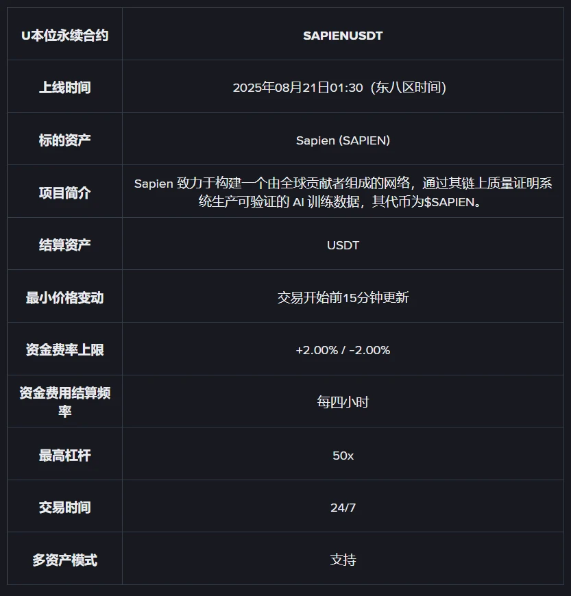 当前位置:首页 > 实时快讯 > 正文 币安Alpha上线Sapien代币交易及永续合约并启动限时空投 实时快讯 作者:猎奇网 时间: 2025-08-20 11:37:46 浏览:30 币安Alpha宣布将于2025年8月21日01:00(东八区时间)上线Sapien(SAPIEN)代币交易,币安合约平台同步于当日01:30(东八区时间)推出SAPIENUSDT永续合约,支持最高50倍杠杆。该平台成为首个开放Sapien合约交易及展示其代币的交易平台,并同步启动限时空投活动:2025年8月21日01:00至8月22日01:00期间,符合条件的用户可通过币安Alpha活动页面使用积分领取独家代币空投。 相关文章: 币安上线 CROSS 代币并启动空投活动2025-07-04 14:04:31 币安上线RCADE交易并启动分阶段空投活动2025-07-09 18:18:51 币安上线Yala代币并启动分阶段空投活动2025-07-22 17:51:22 币安上线Gaia代币并启动分阶段空投活动2025-07-30 14:45:20 币安Alpha上线Towns代币并启动双阶段空投2025-08-05 16:42:13 币安Alpha上线Sidekick(K)代币交易及空投活动启动2025-08-08 14:31:43 币安Alpha上线Sapien代币交易及永续合约并启动限时空投2025-08-20 11:37:46 币安Alpha上线Mitosis(MITO)交易及永续合约,同步开启空投活动2025-08-26 20:35:52 币安合约启动WLFI永续合约盘前交易过渡至标准交易流程2025-09-01 21:13:55 币安Alpha上线Unibase交易及永续合约 最高杠杆50倍并推空投活动2025-09-10 18:06:02