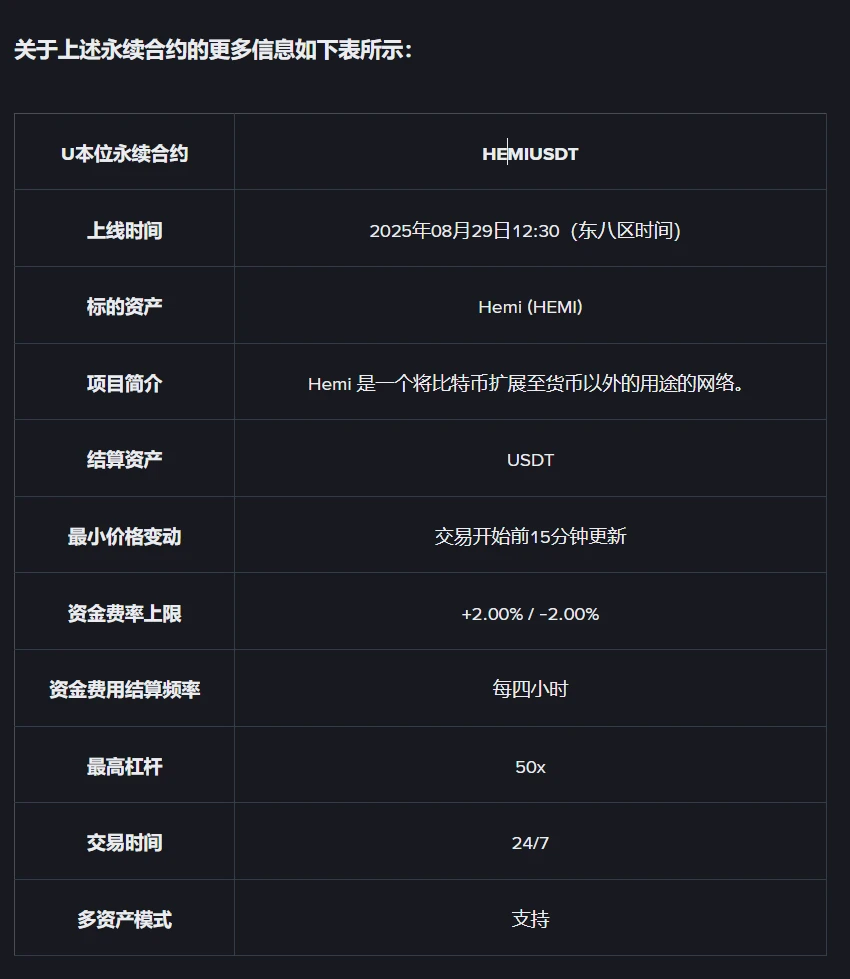 当前位置:首页 > 实时快讯 > 正文 币安Alpha上线Hemi现货及合约交易,推出Booster空投活动 实时快讯 作者:猎奇网 时间: 2025-08-27 22:23:33 浏览:28 币安Alpha平台将于北京时间2025年8月29日12:00上线Hemi(HEMI)现货交易,币安合约平台同步开放HEMI/USDT永续合约交易,该合约产品支持最高50倍杠杆。币安成为首家公告上线Hemi代币现货及合约交易的加密货币平台。符合条件的用户可通过币安Alpha积分参与Booster空投活动,所获代币将在TGE后进入锁定期,期间用户无法提取直至项目方解锁。参与方需自行承担锁定风险、市场波动及项目特有风险,平台明确不对活动收益或流动性提供保证。 相关文章: 币安上线RCADE交易并启动分阶段空投活动2025-07-09 18:18:51 币安Alpha上线NAORIS代币交易及空投活动2025-07-31 19:48:34 币安Alpha上线Sapien交易及空投活动公告2025-08-20 16:37:29 币安Alpha上线Hemi现货及合约交易,推出Booster空投活动2025-08-27 22:23:33 币安Alpha上线Union代币交易及空投活动公告2025-09-04 16:48:24 币安Alpha上线Avantis交易及合约空投活动2025-09-07 22:01:08 币安Alpha上线Unibase交易及永续合约 最高杠杆50倍并推空投活动2025-09-10 18:06:02 币安Alpha上线Aleo并推出空投及交易大赛2025-09-14 15:43:30 币安上线DeAgentAI代币并开放交易及空投活动2025-09-16 19:26:09 WEEX唯客交易所上线STBL现货交易并推出50,000 U新人空投活动2025-09-17 18:03:46