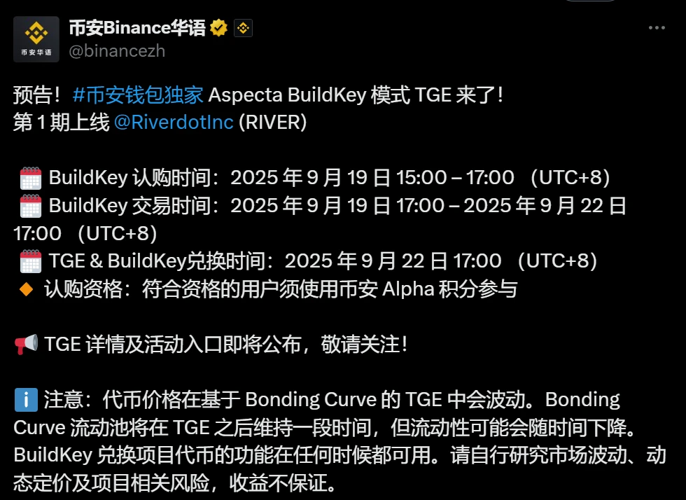 当前位置:首页 > 实时快讯 > 正文 River公布BuildKey TGE参与规则及时间安排 实时快讯 作者:猎奇网 时间: 2025-09-19 14:09:57 浏览:25 River官方披露BuildKey TGE参与规则:用户需在Binance持有至少209个Alpha积分参与第一阶段(BuildKey充值),该阶段将消耗15积分;第二阶段(BuildKey交易)需至少61积分且不扣除积分。时间安排如下:认购期为2025年9月19日15:00至17:00(UTC+8);交易期持续至9月22日17:00(UTC+8);TGE及兑换时间为9月22日17:00(UTC+8)。 相关文章: 美国独立纪念日假期致美股休市 交易市场调整时间安排2025-07-04 15:11:08 Bitget公布2025王者杯全球邀请赛KCGI赛程安排2025-07-09 14:18:00 币安Alpha公布ERA代币两阶段空投规则2025-07-17 17:40:20 Monad代币上线时间与供应量正式公布2025-07-25 09:06:00 币安钱包第36期TGE上线Forest代币,认购时间及参与方式公布2025-08-30 19:32:38 OKX公布WLFI上线及合约转换时间安排2025-08-31 19:10:01 币安钱包Hyperbot TGE活动规则公布:9月3日启动,需231积分参与2025-09-03 14:55:19 OKX公布LINEA分阶段上线时间表2025-09-10 23:30:50 Bybit上线BARD/USDT现货交易及时间安排2025-09-16 21:21:22 River公布BuildKey TGE参与规则及时间安排2025-09-19 14:09:57