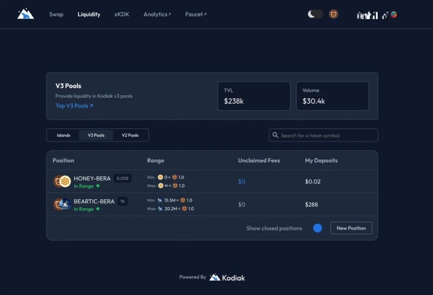 Kodiak通过集中流动性AMM(CLAMM)机制实现了更高效的BGT挖矿。其创新之处在于Kodiak Islands保险库功能,能够自动调整流动性范围,解决了传统CLAMM需要人工管理的痛点。这种设计既提升了资金效率,又通过与原生dApp BEX形成互补关系,确保生态流动性不被闲置。Kodiak采用双代币模型(KDK和xKDK),其中xKDK作为治理代币可分享协议收益,展现了Berachain生态中协议如何创新性地利用PoL机制。